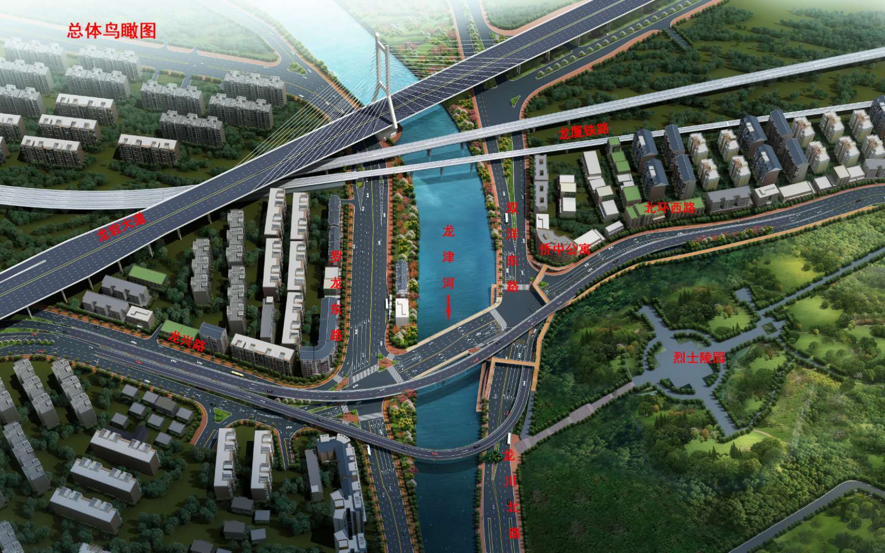 沿北環(huán)西路、龍興路設(shè)置南北分離式雙向四車道高架,南側(cè)接龍興路,北側(cè)接現(xiàn)狀北環(huán)西路,高架靠東側(cè)布置(緊貼烈士陵園),橋梁總長約1140米,凈寬約7.7米;在雙洋路、龍川北路、北環(huán)西路設(shè)置人行天橋,與山體步道銜接,以完善慢行系統(tǒng);在烈士陵園山體下采用明挖回填方式設(shè)置框涵,長度約225米,凈寬10.75米。