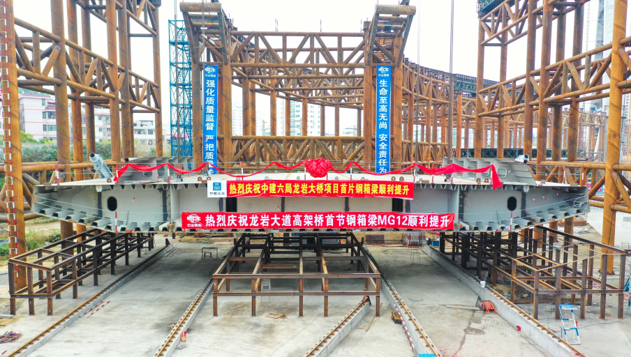 2019年12月31日上午9:28,龍巖大橋主橋首片鋼箱梁開始吊裝,標(biāo)志著龍巖大橋主橋正式進入鋼箱梁施工階段。首片鋼箱梁提升、滑移、頂推共歷時約8小時完成,整個主橋結(jié)構(gòu)共有26片鋼箱梁。