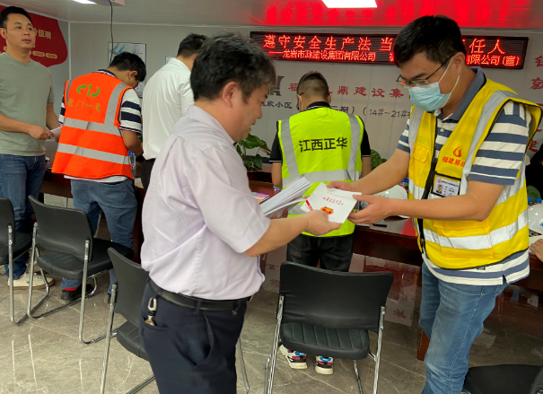 現(xiàn)場徐旺興董事長、修海金副總經(jīng)理分別向項目部人員及工人現(xiàn)場分發(fā)《安全生產(chǎn)法》及“五進(jìn)”等宣傳資料。